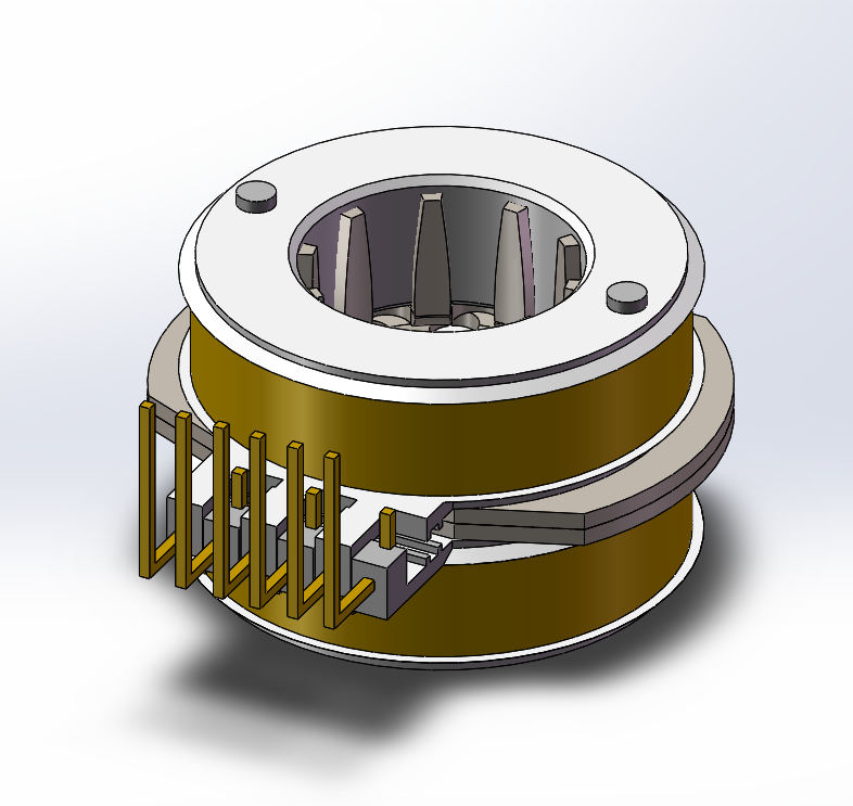 - 該三維圖為彎針裝配圖,主要用在圓環銅片插針折彎工序上,通過上下兩側圓柱夾具完成銅環夾緊滾筒。...