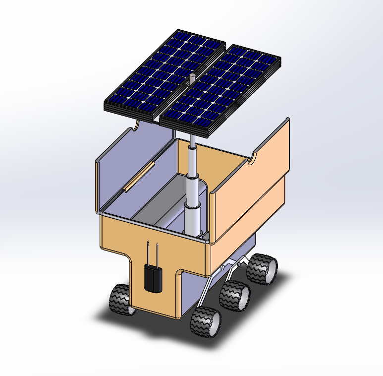 - 月球火炬模型圖,整個系統打包后占用2.0m x 1.5m x 1.2575m的空間。定日鏡設計為滑動機構,可以輕松平鋪以增加反射面積。光伏陣列作為單獨的滑塊包含在內。定日鏡中間有一個太陽能跟蹤器。輪子有一個搖桿機構,可以移動以實現緊湊的包裝。前面還提供無線通信,后面提供無線供電。...